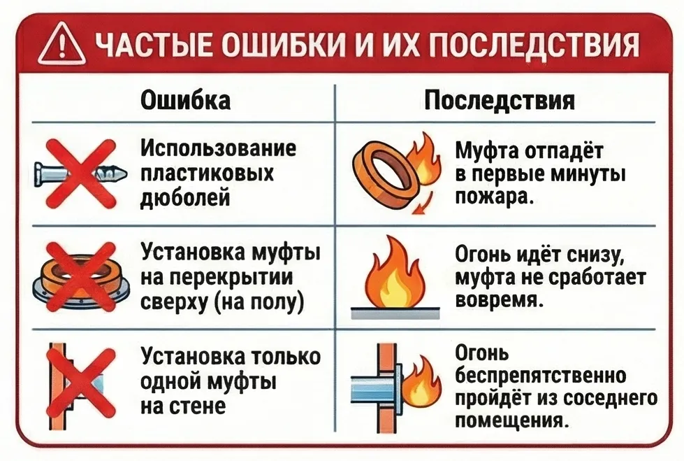 Всегда сверяйтесь с проектом здания. Установка муфты с низким пределом огнестойкости в мощное перекрытие сделает его уязвимым местом ("слабым звеном").