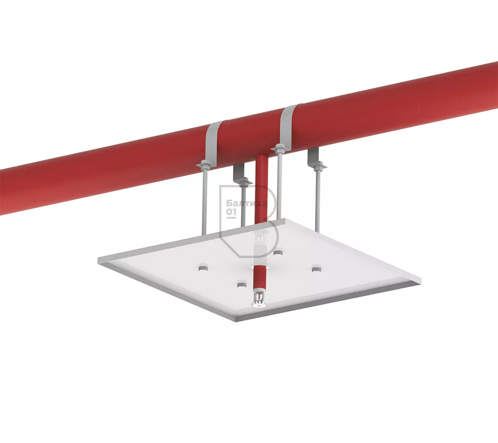 Квадратные экраны с креплением на трубу устанавливаются на уже смонтированные оросители, установленные оросителем вниз. Систему крепежа (входит в комплект поставки) необходимо надеть сверху на горизонтальную трубу, далее экран через центральное отверстие надеть на ороситель и через соответствующие отверстия совместить с системой крепежа, далее отрегулировать необходимую высоту посадки экрана относительно оросителя и затянуть крепеж.