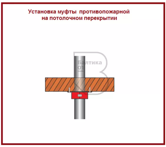 Муфта противопожарная «БАЛТИКА ПМ» 200 имеет терморасширяющийся на основе интеркалированного графита. В момент возникновения пожара, под воздействием высоких температур (от 120°С), материал начинает моментально вспучиваться, трехмерно расширяясь и заполняя отверстие в перекрытии.