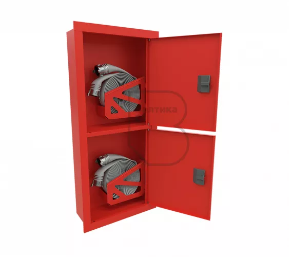 Дверца пожарного шкафа открывается на 160 градусов, открывание двери универсальное (правое и левое). Дверца имеет дополнительные загибы для усиления жесткости конструкции. На двери и корпусе шкафа предусмотрены отверстия для опломбирования шкафа. Дверь пожарного шкафа имеет запорное устройство в виде пластиковой защелки. Дверь закреплена с помощью монтажного штифта, при необходимости она может быть снята в результате простого нажатия на кнопку штифта.