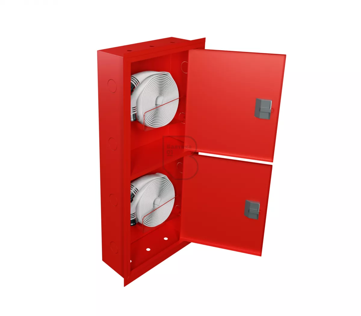 Дверцы пожарного шкафа открываются на 160 градусов. Имеют запорное устройство в виде пластиковой защелки.